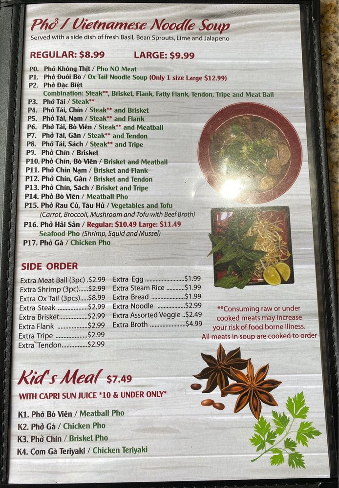 Vietnamese noodle soup with brisket, meatballs. Options: large or regular.