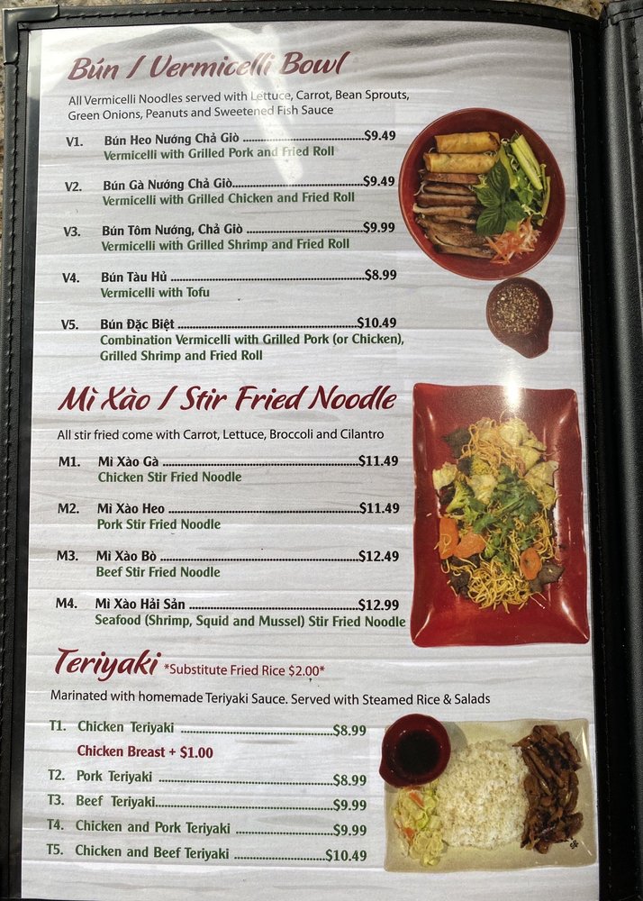 Pork teriyaki typically includes grilled pork glazed in a Vietnamese-style teriyaki sauce.